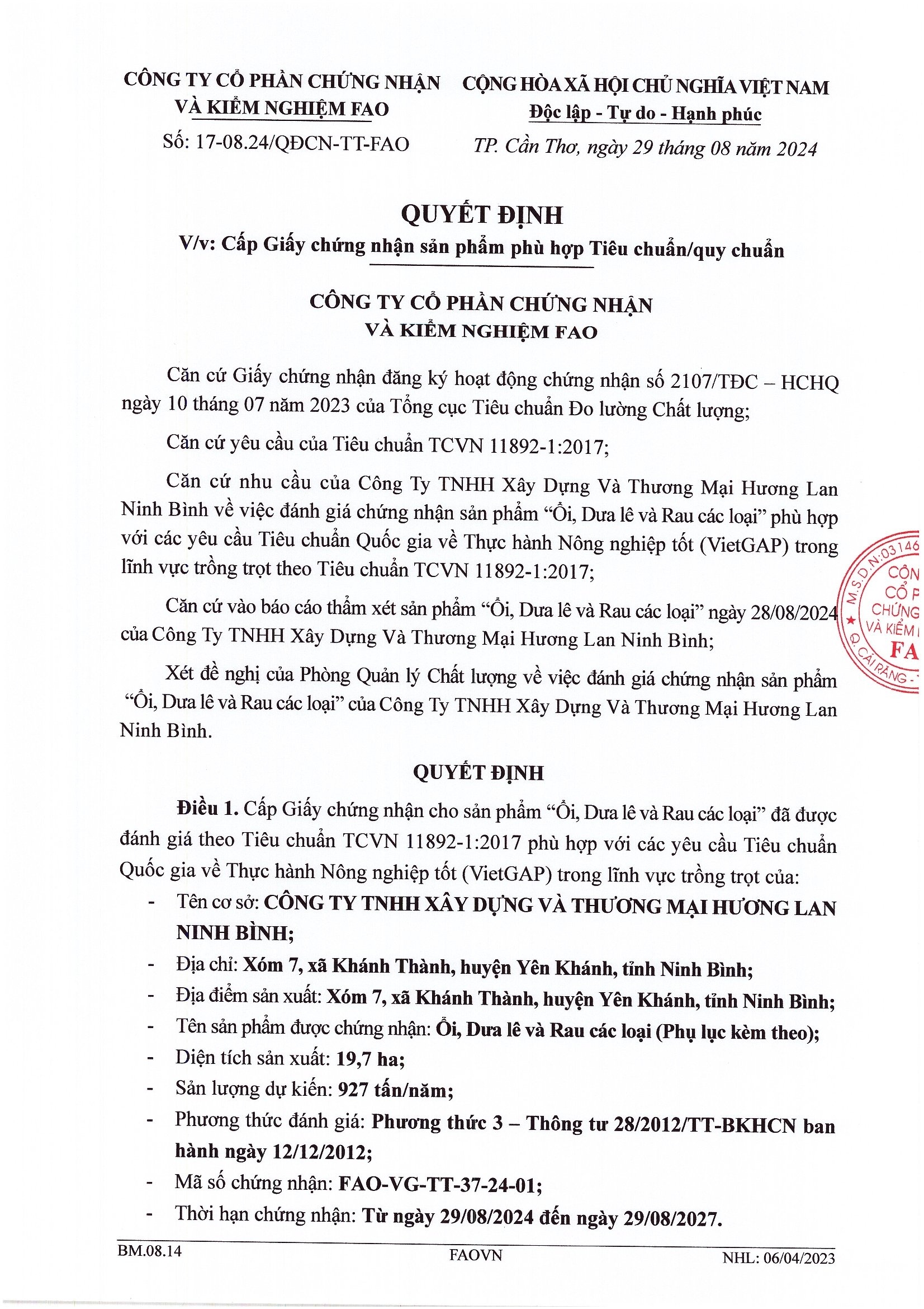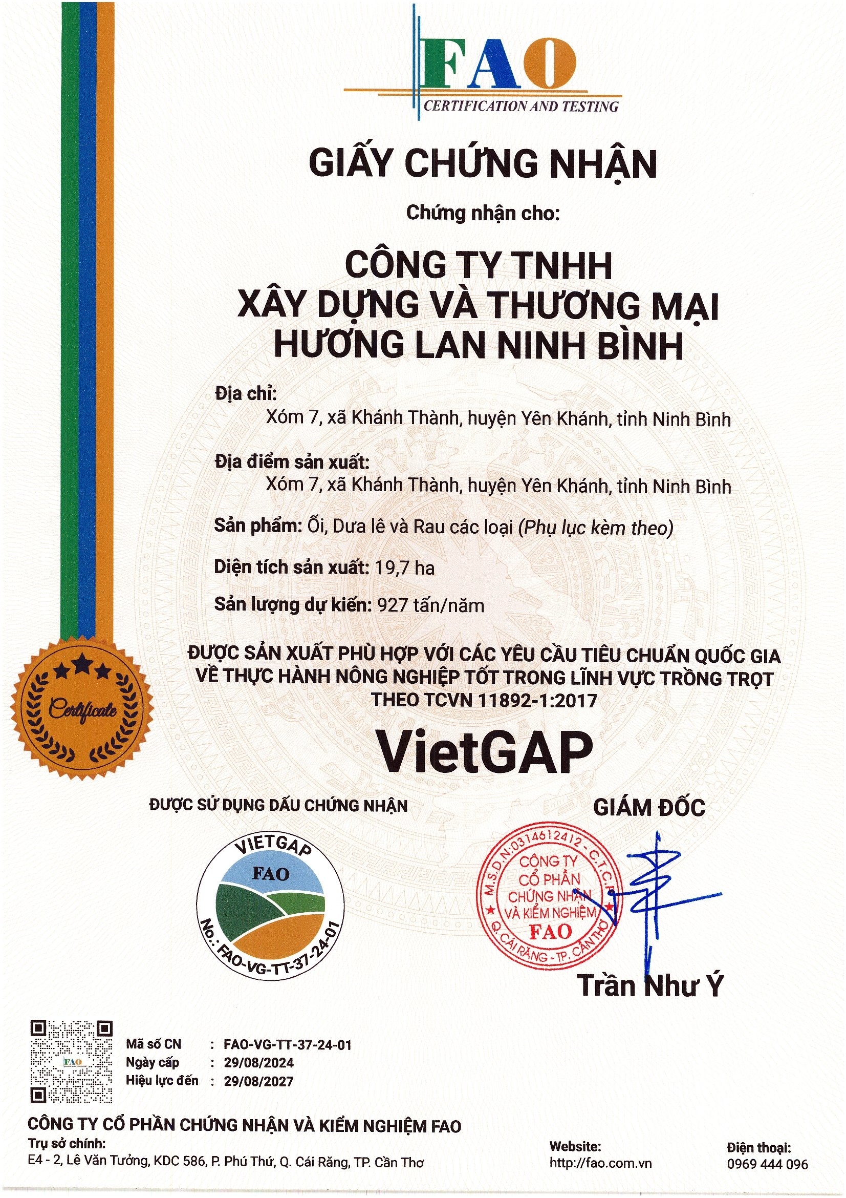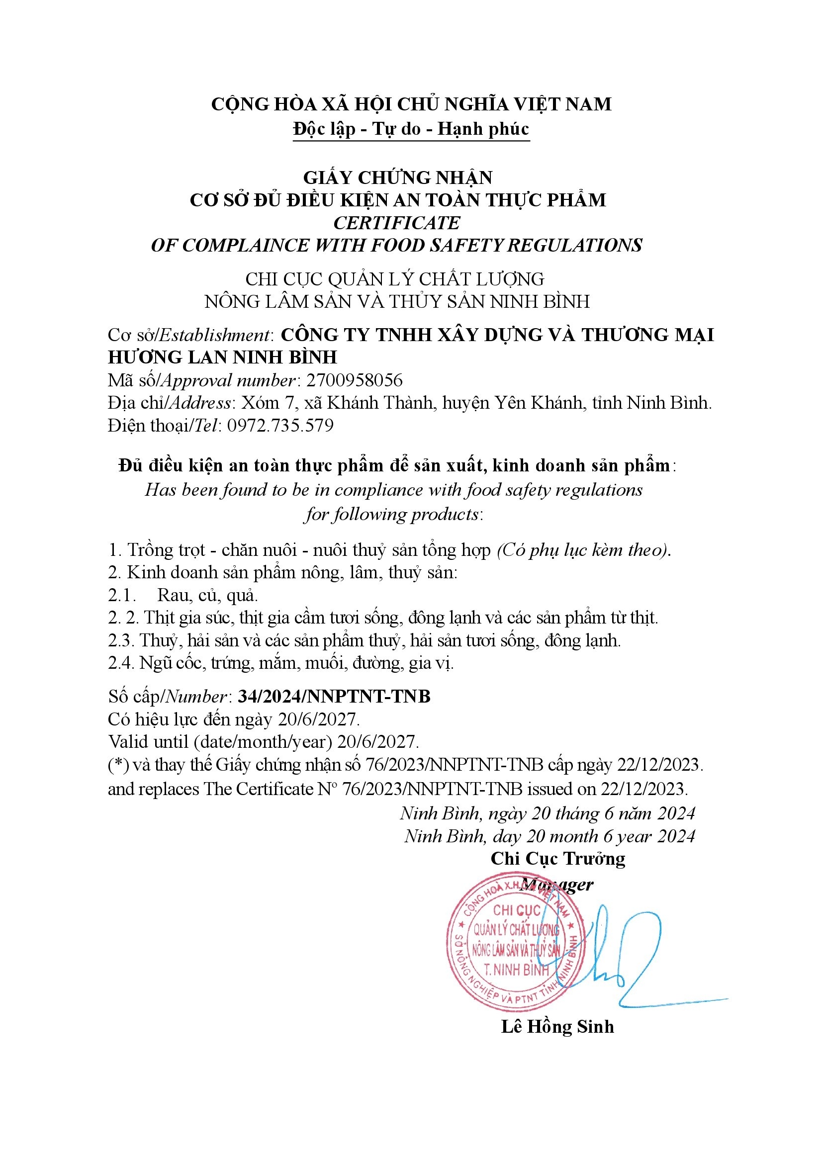 Tên đơn vị/nhà sản xuất: công ty TNHH xây dựng và thương mại Hương Lan